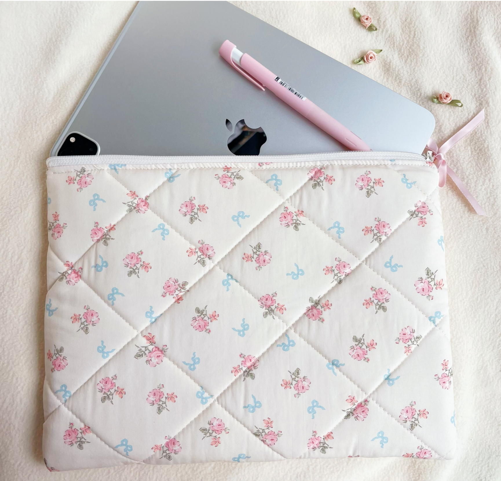 Beautiful flowers and bow handmade quilted Laptop Sleeve