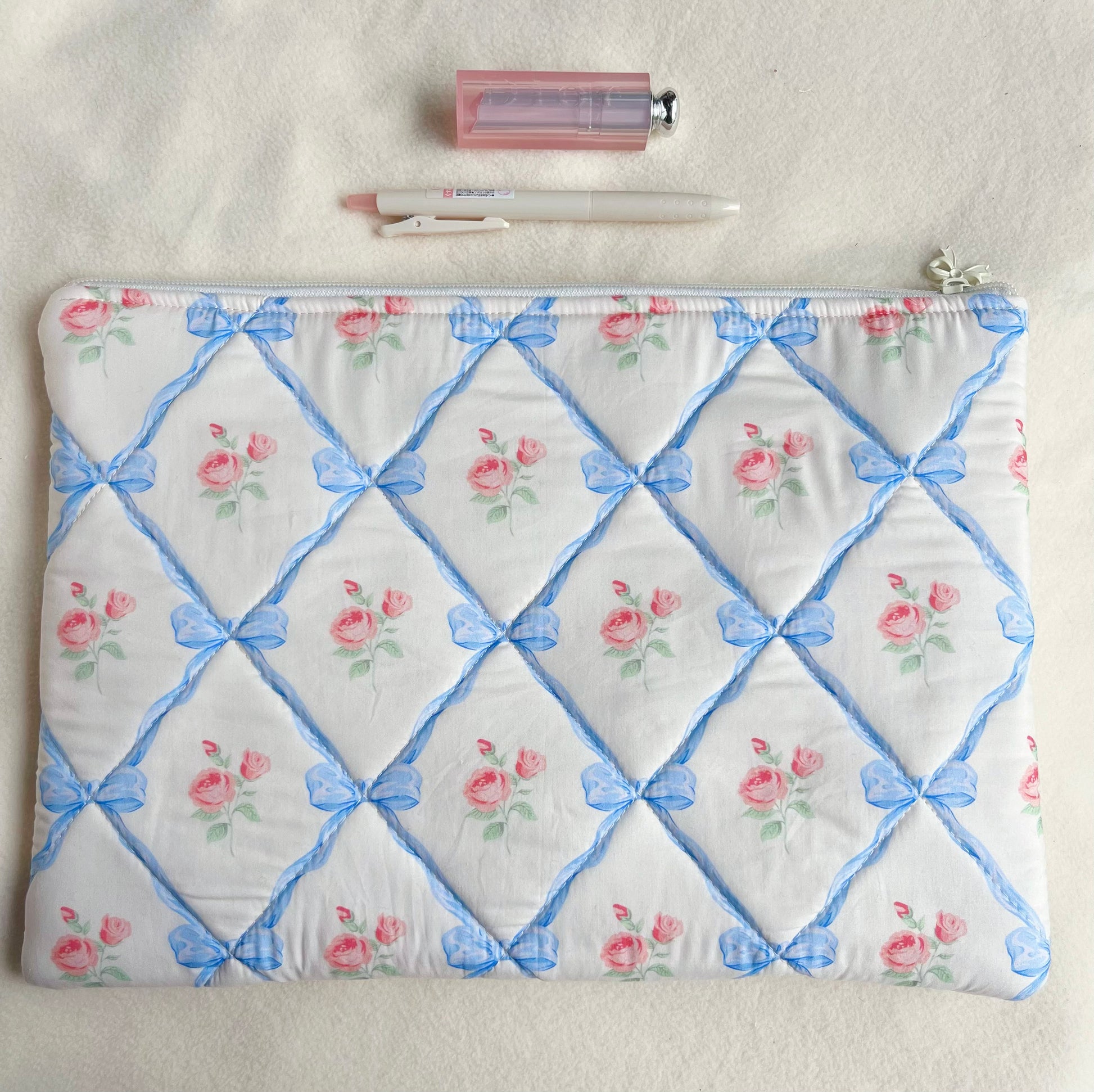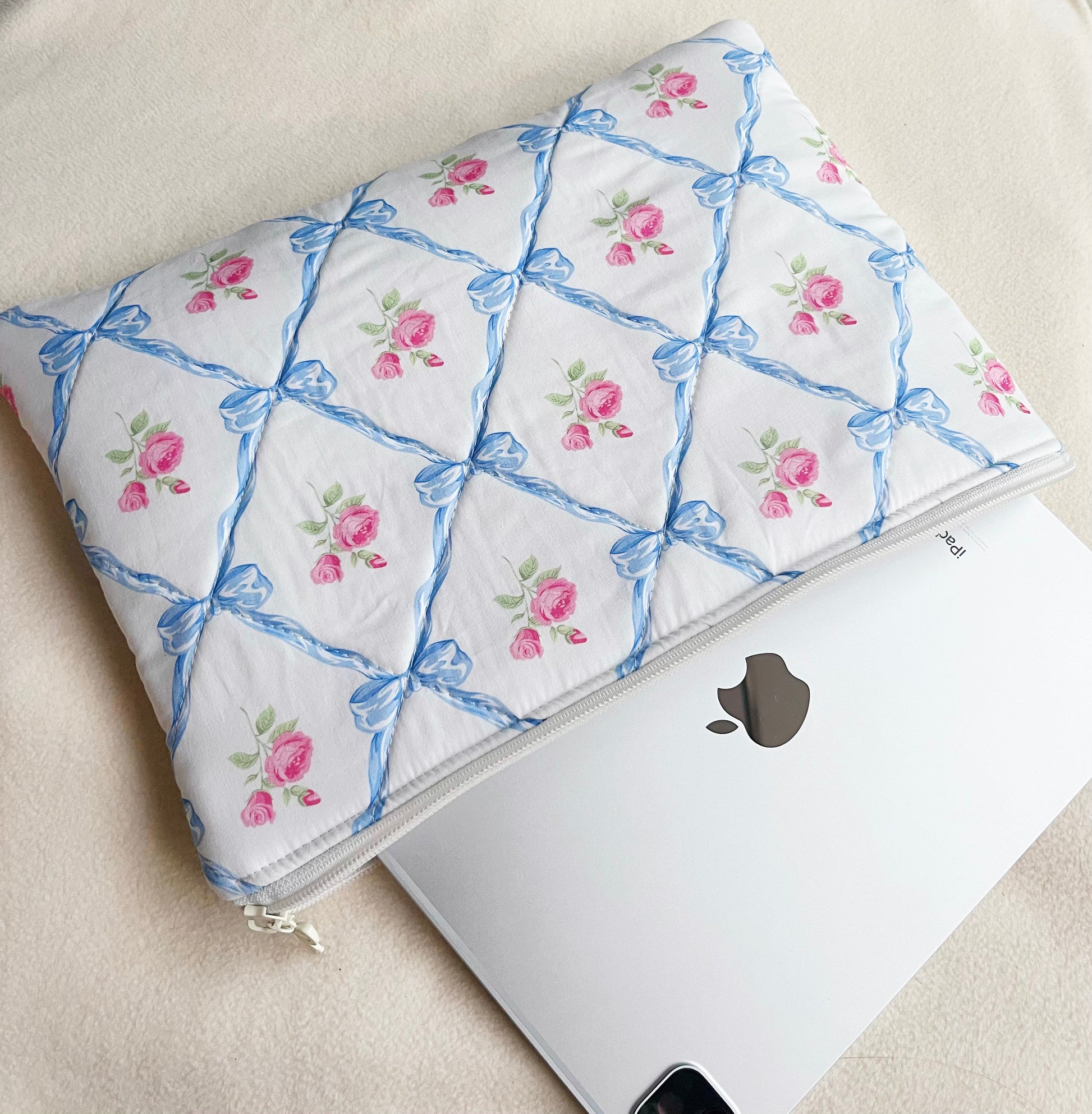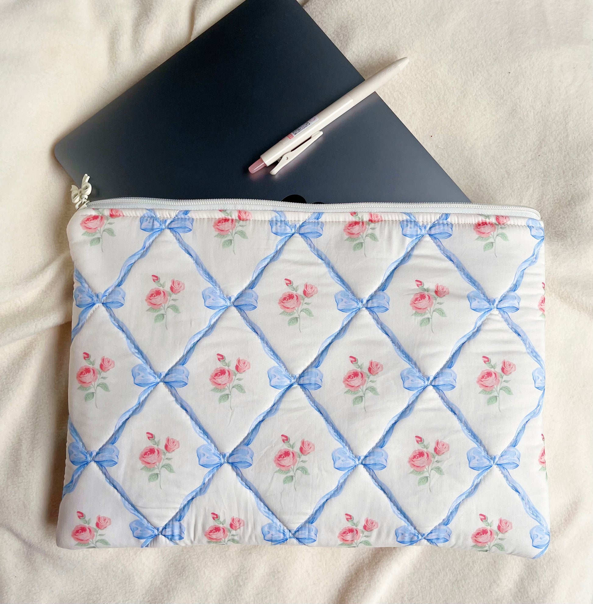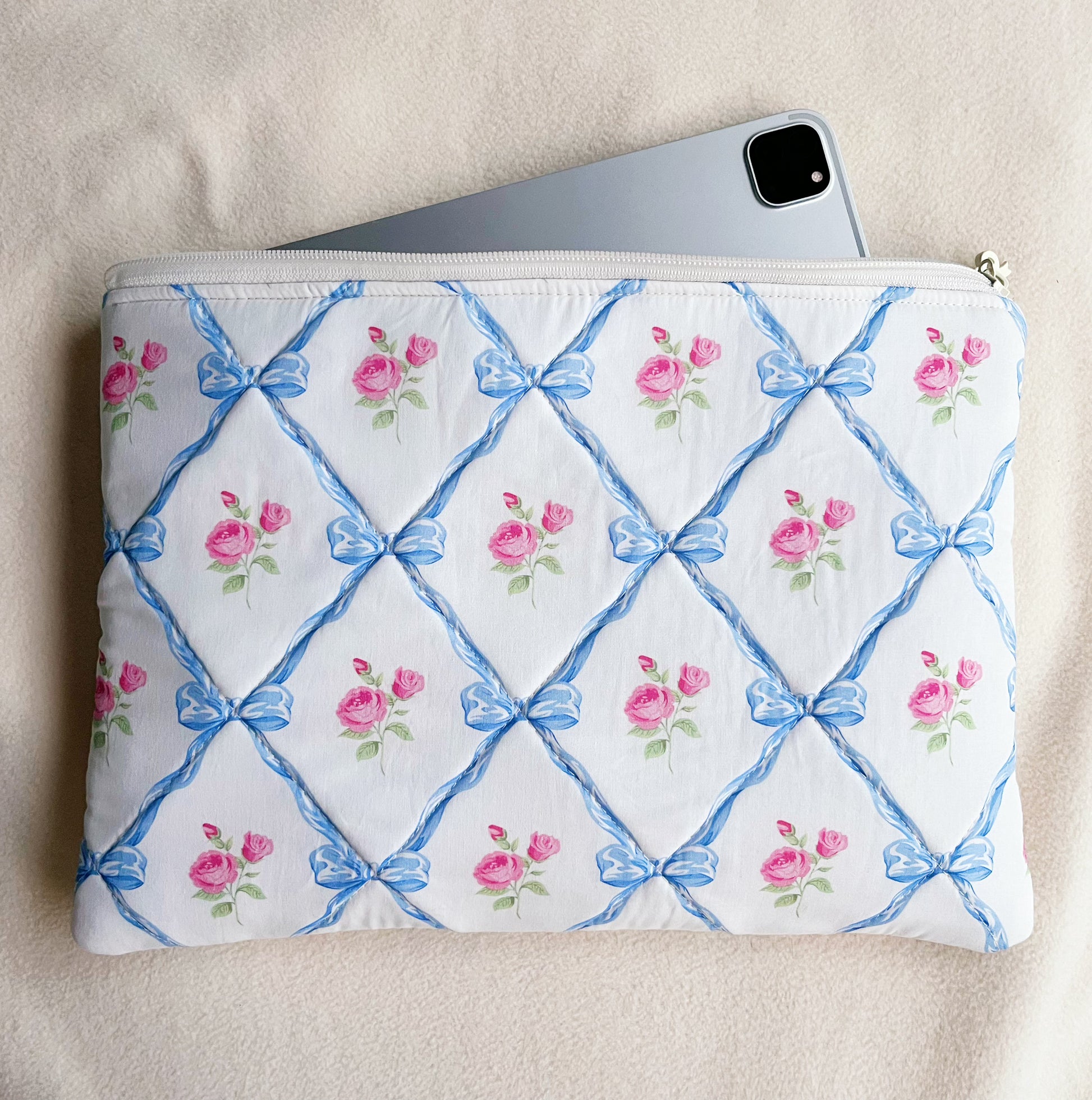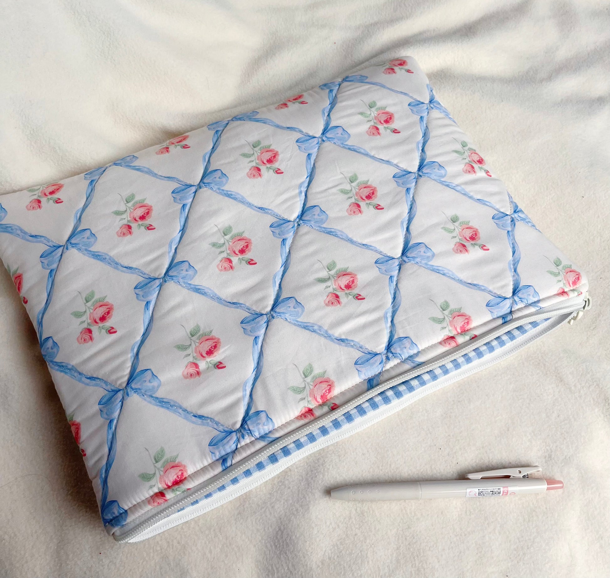 Handmade blue ribbon quilted Laptop Sleeve, Quilted iPad Pouch,Blue floral with blue gingham lining laptop bag/sleeve, Gift for her