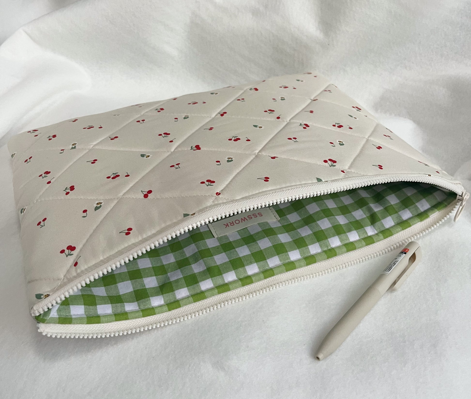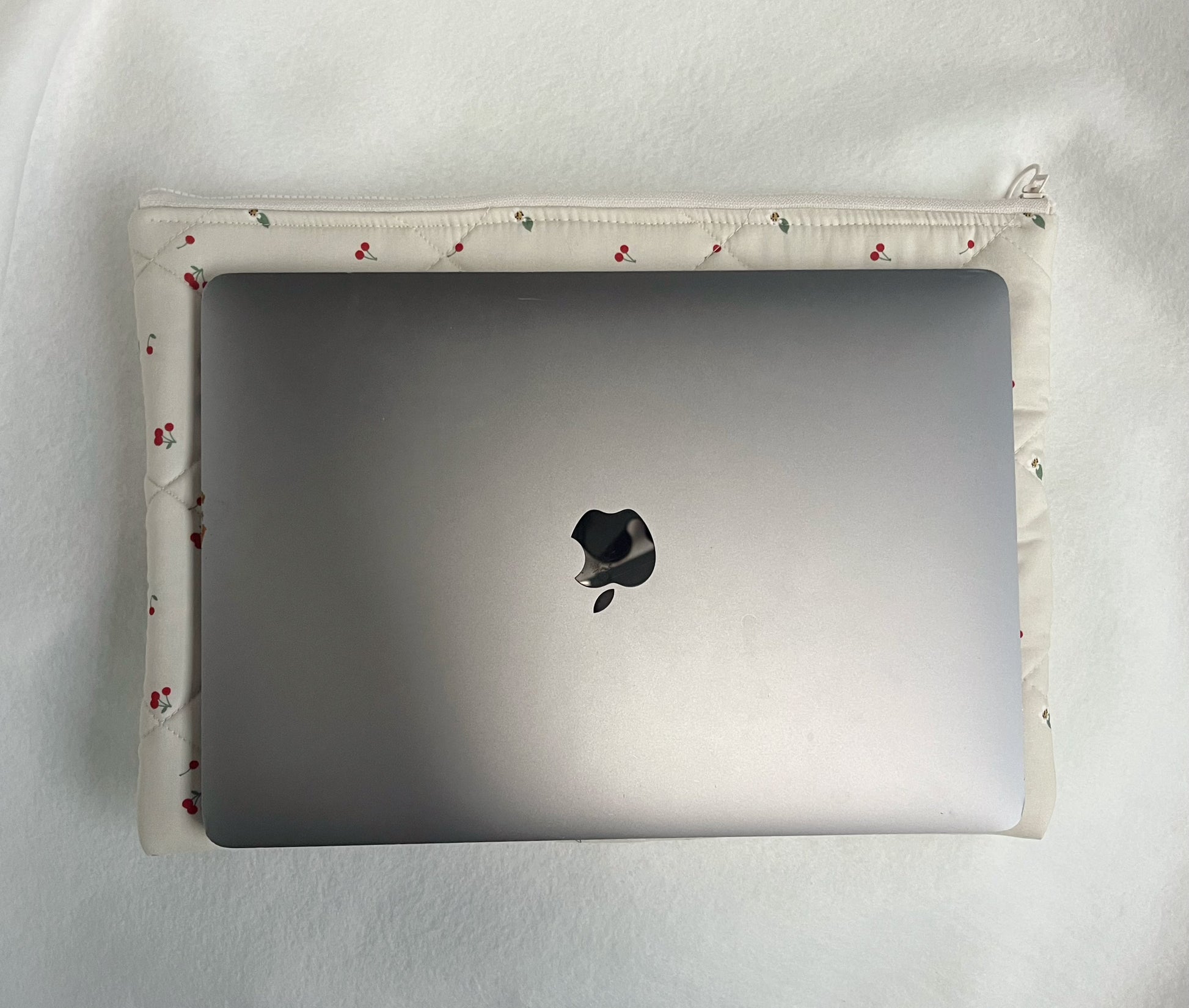 Handmade quilted Laptop Sleeve, Quilted iPad Pouch, Cherry with Green gingham lining laptop bag