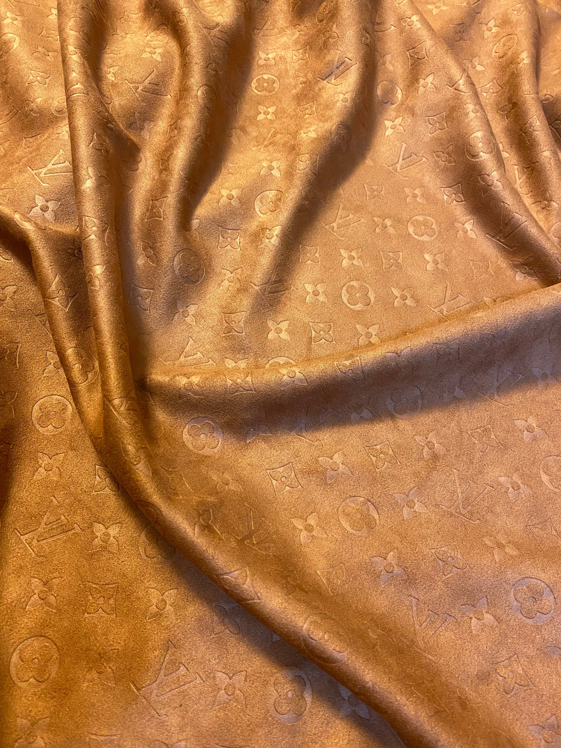 This custom luxury Louis Vuitton fabric features a soft and warm suede texture in a rich brown color, perfect for handmade clothing.