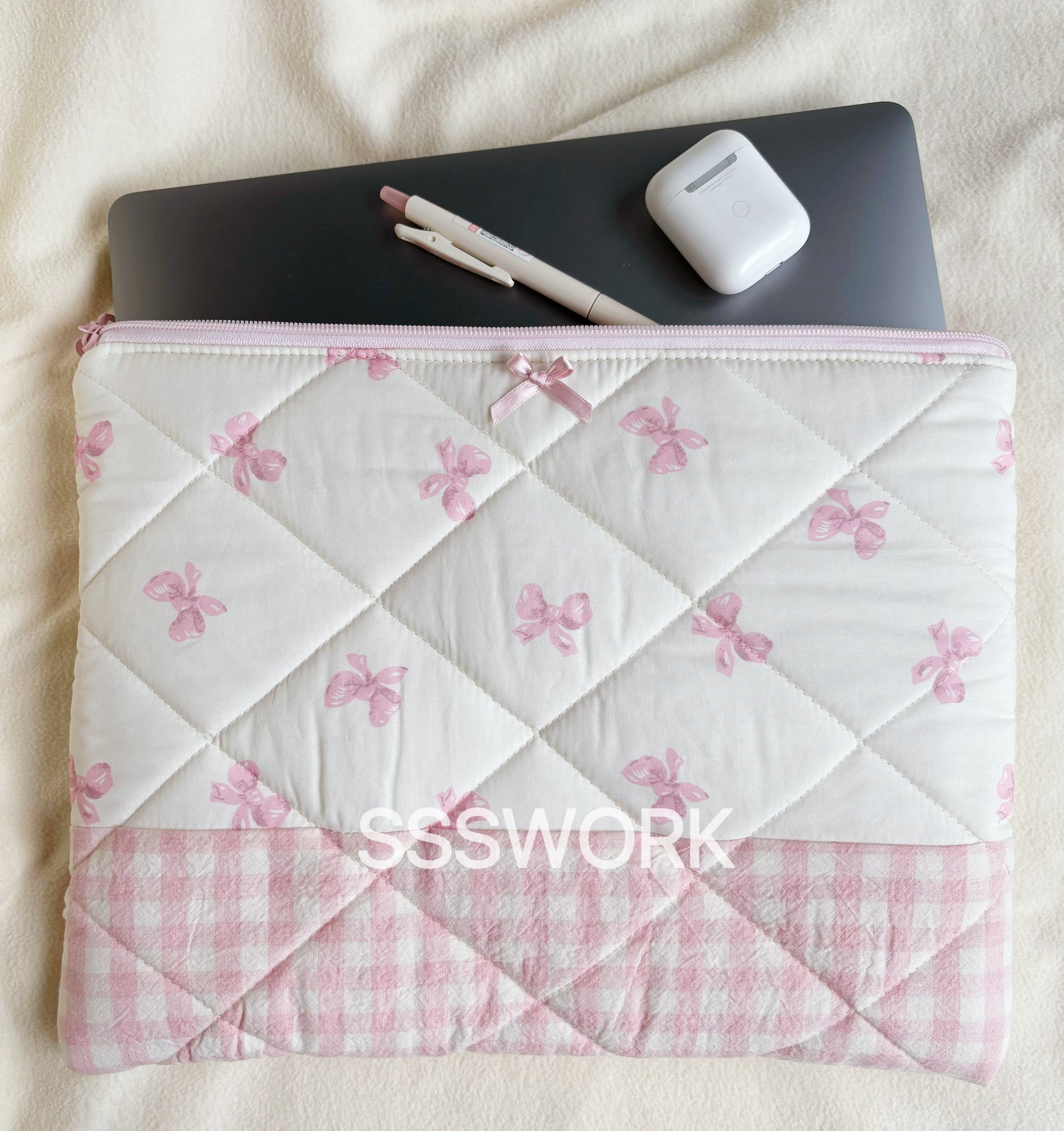 Pink bow handmade quilted Laptop Sleeve, Quilted iPad Pouch, Gift for her