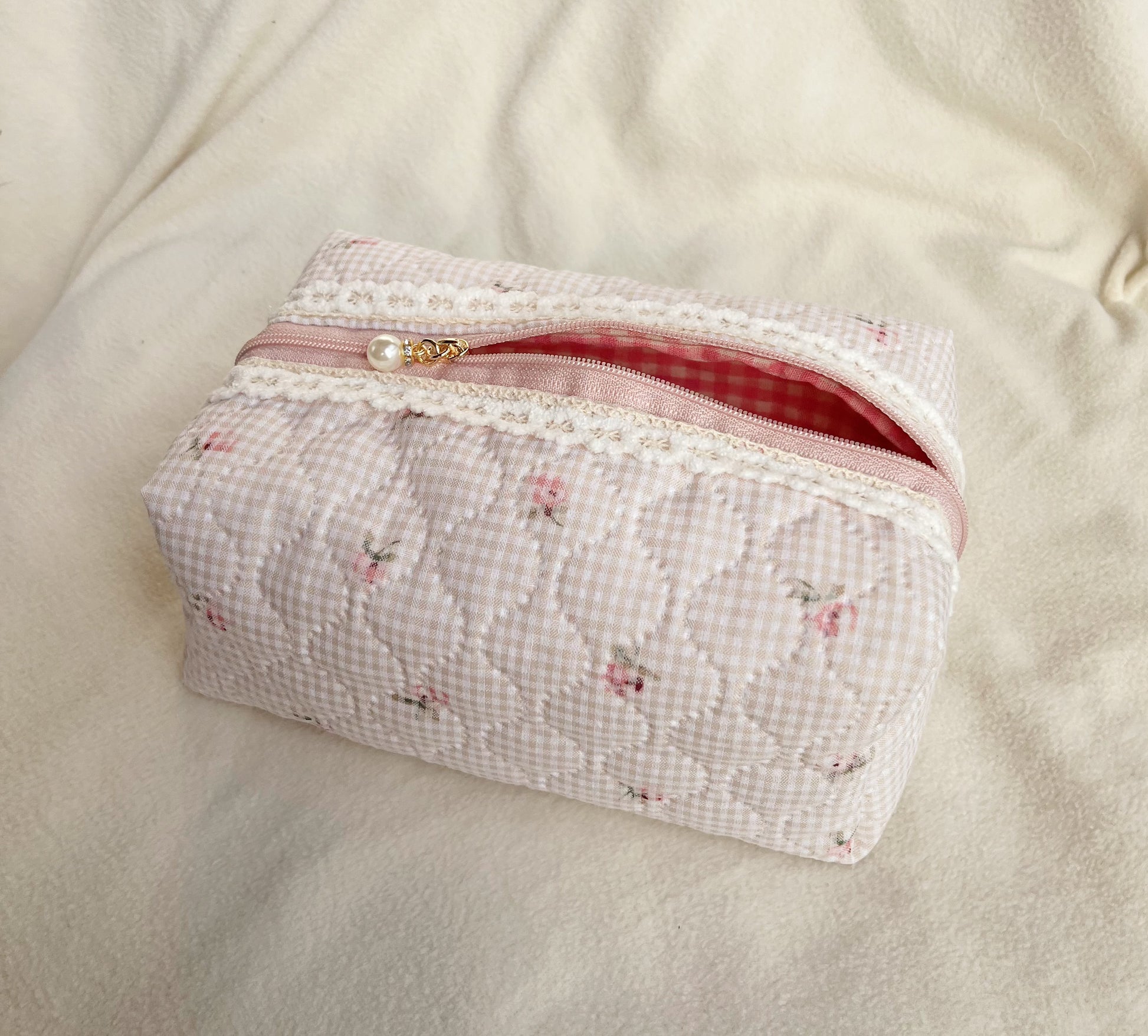 Quilted makeup bag beige fabric with pink gingham lining,Bridesmaid gift, Gift for her