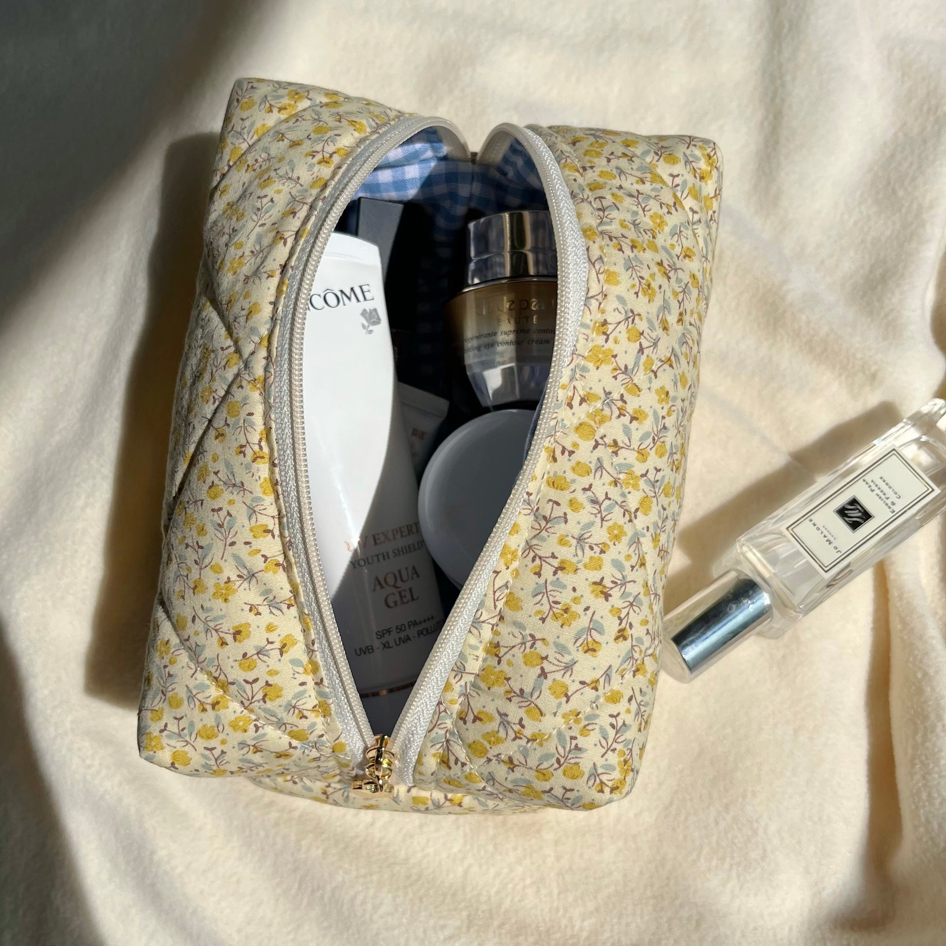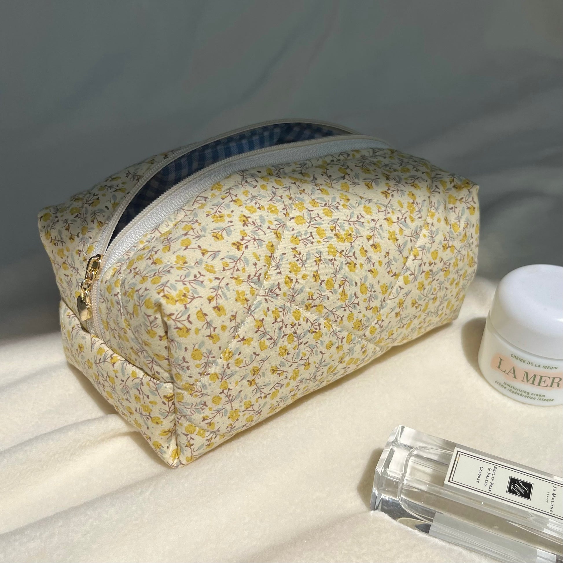 Quilted makeup bag in yellow floral with blue gingham lining, Cosmetic bag, Gift for her
