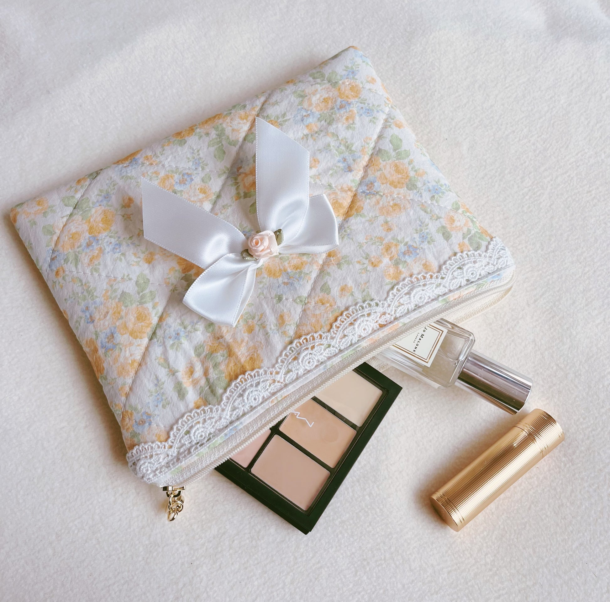 Yellow flower lace makeup bag, cosmetic organizer, Handmade lace coin purse, Bridesmaid gift, gift for her